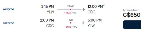 Google Flights: Kelowna to Paris, France